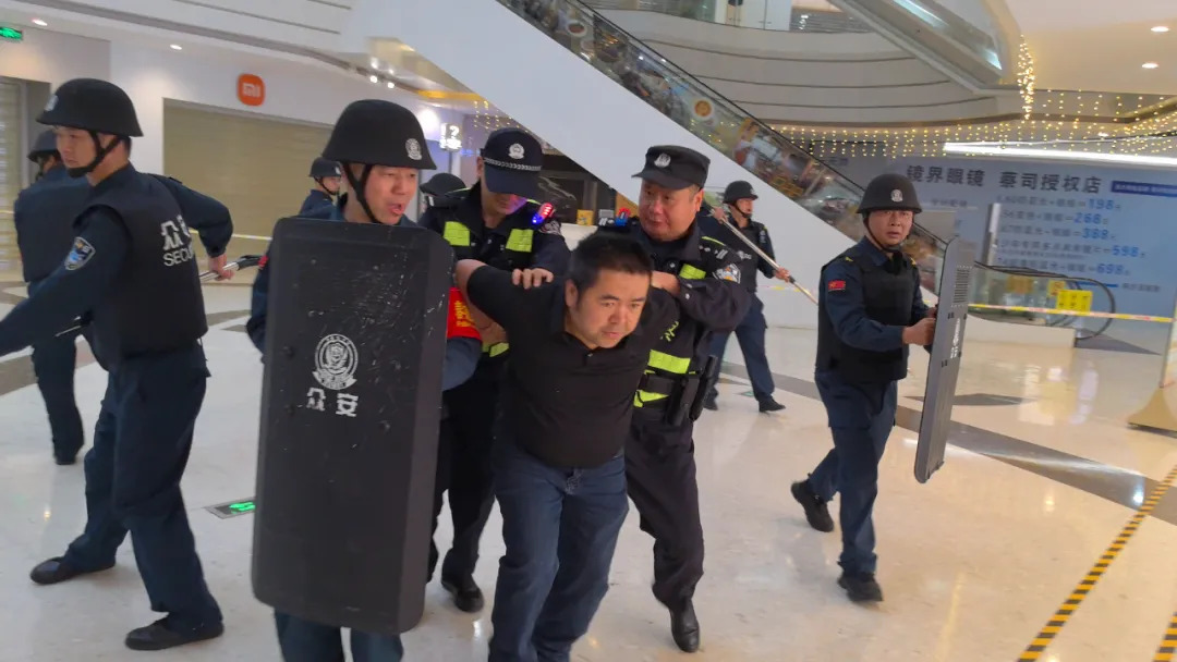 演練模擬“犯罪分(fen)(fen)子”搶劫(jie)商鋪,商場巡(xun)邏保安發(fa)現后立即上前處置(zhi),并通過對講機(ji)報告(gao)情況呼叫支(zhi)援,網點(dian)負責人組(zu)織應急處突小組(zu)以三人最小作戰(zhan)單元的(de)方式對“犯罪分(fen)(fen)子”進行抓(zhua)捕,同時向(xiang)轄區(qu)派出所報警。在網點(dian)保安、派出所民警、醫護人員的(de)密切配合下,“犯罪分(fen)(fen)子”被第一時間制服羈押。