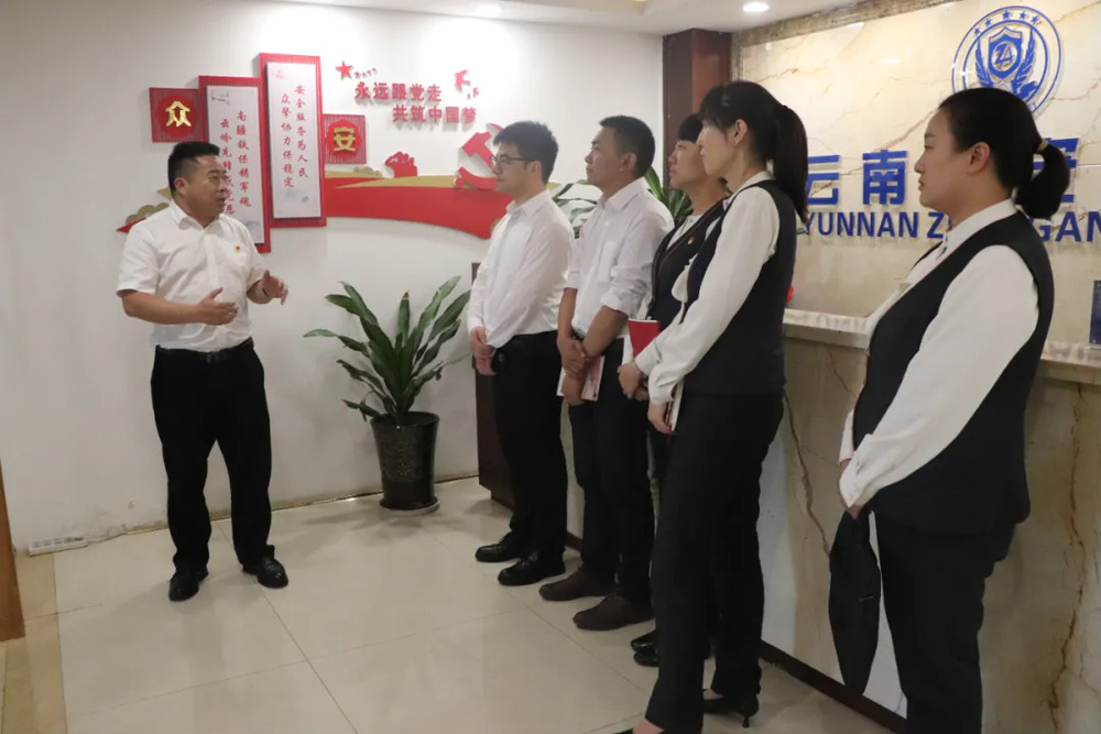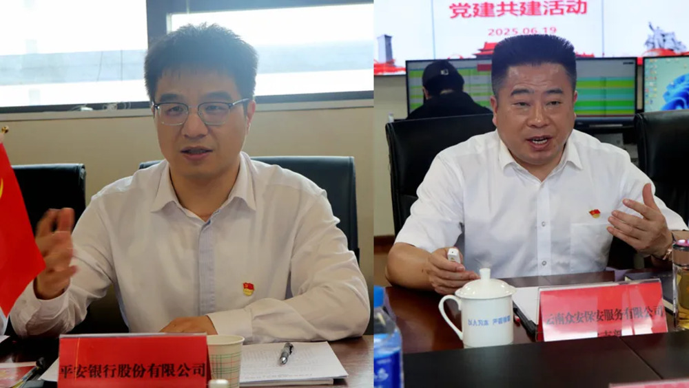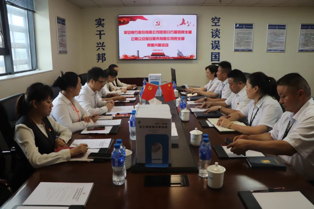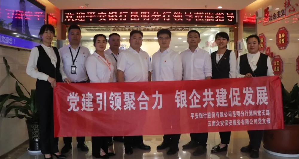 在(zai)中國共產黨(dang)成立104周(zhou)年紀(ji)(ji)念日即將到來之際(ji),為深入(ru)學習(xi)貫(guan)徹黨(dang)的(de)二十(shi)大精神,加強黨(dang)的(de)紀(ji)(ji)律(lv)建(jian)設、推動全(quan)面從嚴治黨(dang)向縱深發展,進一步激勵廣大黨(dang)員干部(bu)(bu)堅(jian)定(ding)理想(xiang)信(xin)念,強化責任擔當。2025年6月19日,云(yun)南(nan)眾(zhong)安(an)(an)保安(an)(an)服務有限公司黨(dang)支部(bu)(bu)與平(ping)安(an)(an)銀(yin)(yin)行(xing)(xing)(xing)(xing)股份有限公司昆明分行(xing)(xing)(xing)(xing)第四黨(dang)支部(bu)(bu)共同開展了(le)“黨(dang)建(jian)引領(ling)聚合(he)力,銀(yin)(yin)企共建(jian)促發展”主題(ti)黨(dang)日活動。平(ping)安(an)(an)銀(yin)(yin)行(xing)(xing)(xing)(xing)股份有限公司昆明分行(xing)(xing)(xing)(xing)第四黨(dang)支部(bu)(bu)書記(ji)瞿軍一行(xing)(xing)(xing)(xing)、云(yun)南(nan)眾(zhong)安(an)(an)保安(an)(an)公司黨(dang)支部(bu)(bu)書記(ji)朱邦瑞及(ji)公司黨(dang)員代(dai)表參加了(le)活動。
