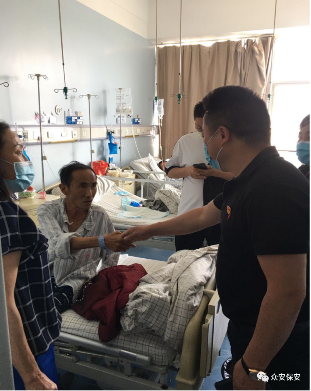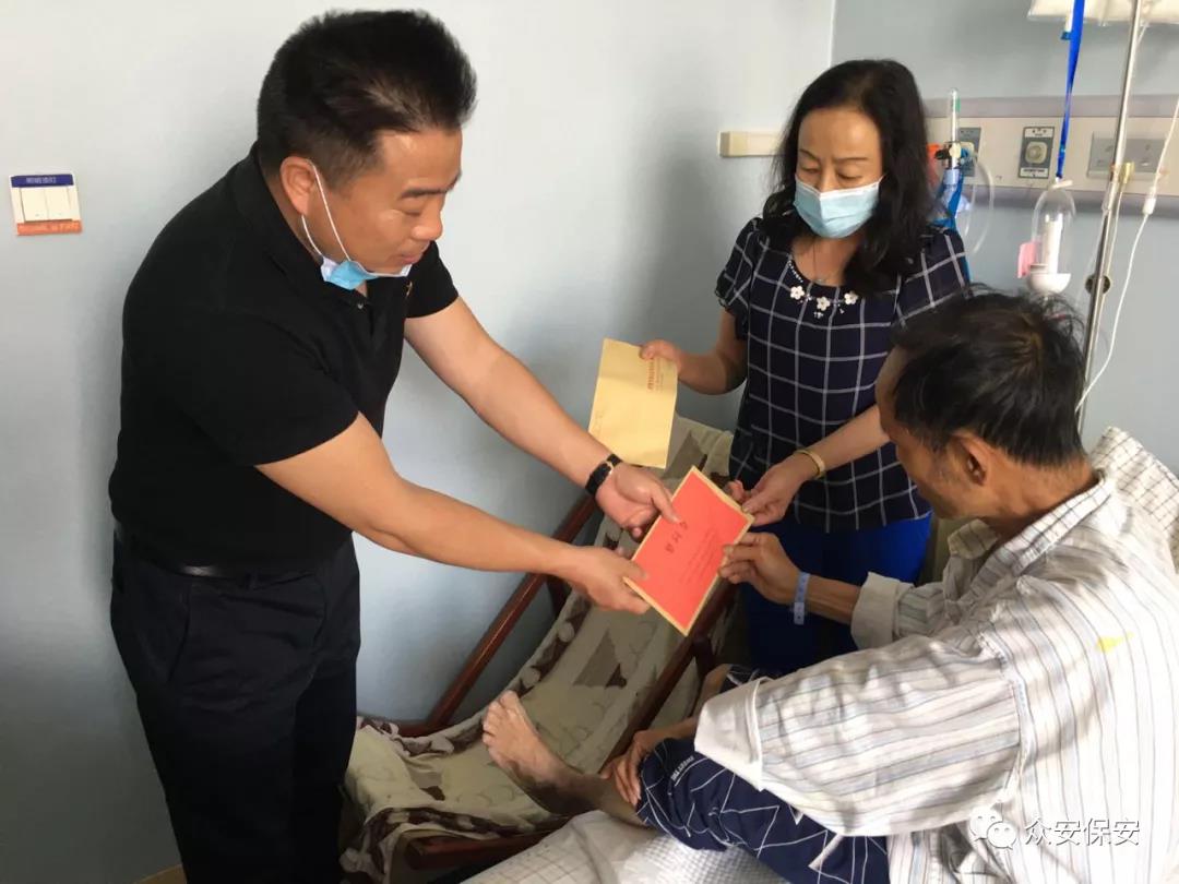 2020年5月15日下午,在昆明市西山區退役軍人事務局馬萍副局長(chang)、雙擁(yong)優撫科(ke)(ke)李(li)朝紅(hong)科(ke)(ke)長(chang)率領(ling)下,云(yun)南(nan)眾安(an)保安(an)服(fu)務有(you)限公司黨支(zhi)部書記、總裁(cai)朱邦瑞,市場部總監趙輝,綜合管理部主(zhu)任郭立波一行5人,赴云(yun)南(nan)省腫瘤(liu)醫院親切看望并(bing)慰問越戰參戰老兵(bing)趙勇剛英雄。