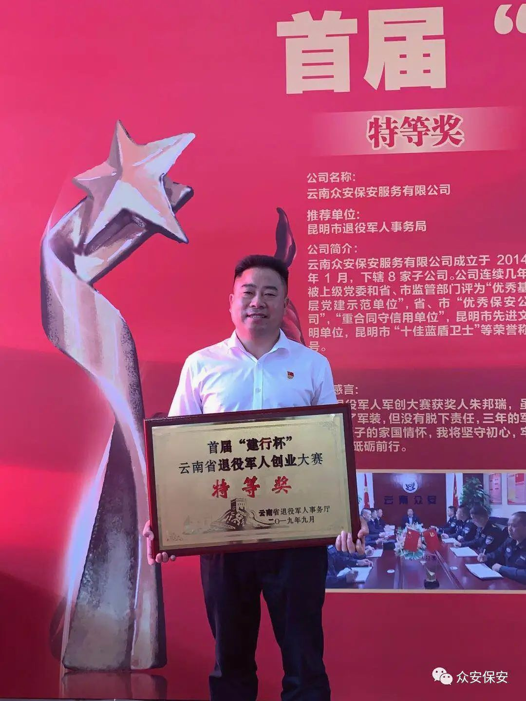 2014年懷(huai)著(zhu)家國情懷(huai)的(de)初心和夢想創(chuang)辦云南(nan)眾安(an)(an)保(bao)安(an)(an)服務有限(xian)公(gong)司,經過艱(jian)苦創(chuang)業8年發展成為多元化集團(tuan)企業,先后解決退役軍(jun)人(ren)2800余(yu)(yu)(yu)(yu)人(ren),下崗職工2300余(yu)(yu)(yu)(yu)人(ren),大學生2000余(yu)(yu)(yu)(yu)人(ren),待業青年2700余(yu)(yu)(yu)(yu)人(ren),農村(cun)剩余(yu)(yu)(yu)(yu)勞動力(li)100000余(yu)(yu)(yu)(yu)人(ren)的(de)就業。云南(nan)眾安(an)(an)現(xian)有員工10000余(yu)(yu)(yu)(yu)人(ren),覆蓋全省各州市,年營業額上億元,累計上繳利(li)稅近2000萬(wan)元。