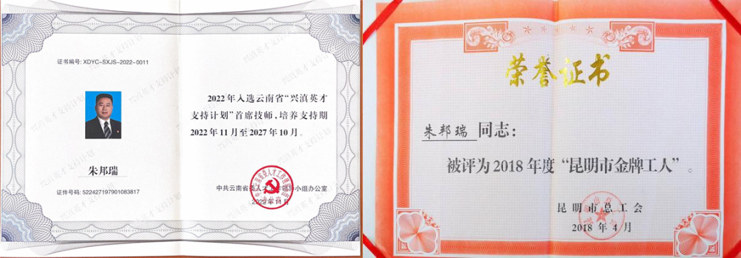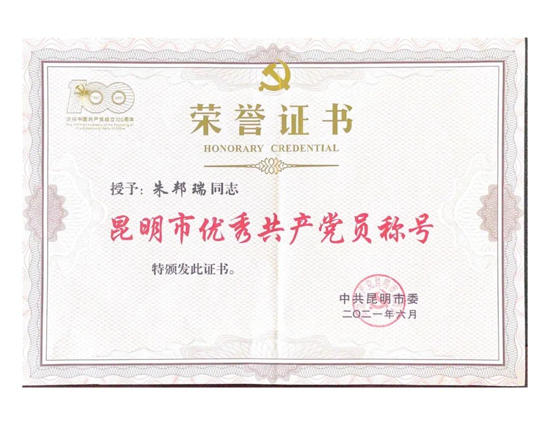 因黨(dang)建(jian)工作突出(chu),朱邦瑞被昆(kun)明市(shi)委(wei)表(biao)彰(zhang)為“優(you)秀共產黨(dang)員(yuan)”,2020、2021年公司(si)支部先后被昆(kun)明市(shi)委(wei)、云南(nan)省委(wei)評為“規范(fan)化(hua)建(jian)設示范(fan)黨(dang)支部”。